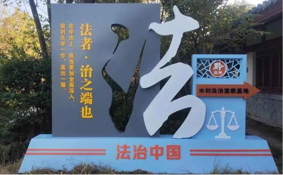 走进黔南州水利法治宣传教育阵地VR全景展厅,可以看到,这个阵地地处都匀市三江堰湿地公园湖心岛,依水而建,沿水文化长廊循行而入,首先映入眼帘的是四座耸立的户外水法治雕塑群,分别为“法治中国”“法治政府建设”“水法治故事”和“法”字造型雕塑。室内展厅分四个部分集中展示了宪法的发展历程,中央关于全面依法治国的历次会议精神,中国水法律体系的历史沿革和现行的水法律法规、规章和地方性水法规体系情况,同时展示黔南州水务法治政府建设工作开展情况和取得的成效等,进一步展现通过依法治水、依法管水后,水环境日趋向好,江河一片安澜,人民过上幸福安康生活,分享良好水生态红利的美好景象。