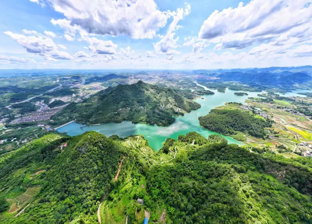 俯瞰遵义市中桥水库,澄澈的库水如宝石般镶嵌在连绵群山之中。四周青山苍翠,山水相依,植被繁茂,与碧波荡漾的水库交相辉映,构成一幅绝美生态画卷。