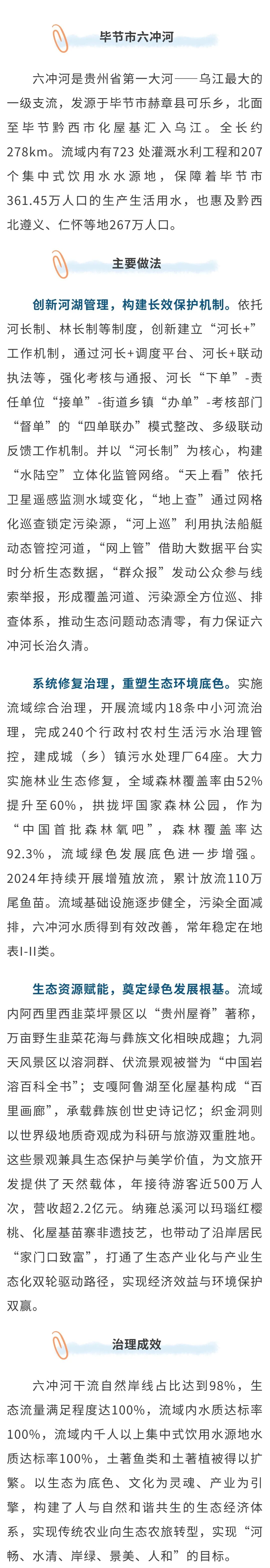 为深入贯彻落实习近平生态文明思想,按照国家关于推进美丽中国建设的决策部署以及省委、省政府有关工作要求,贵州省生态环境厅、贵州省水利厅按照《贵州省美丽幸福河湖评定管理办法(试行)》开展了2025年度贵州省美丽幸福河湖评定工作。经专家审核和公开征求意见,将毕节市六冲河等9条(个)河(湖)评定为2025年度贵州省美丽幸福河湖优秀案例。