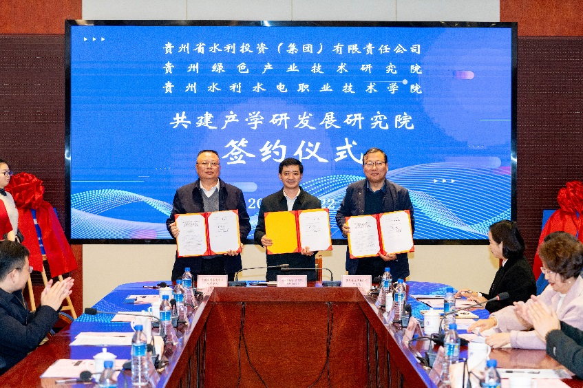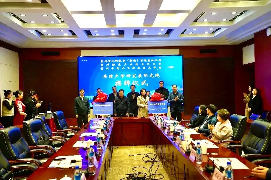 11月22日上午,贵州省水利投资(集团)有限责任公司、贵州绿色产业技术研究院、贵州水利水电职业技术学院(下称“三方”)携手合作,共建的“产学研发展研究院”在贵州水利水电职业技术学院正式揭牌成立。三方将在战略研究与规划、技术研究及应用、对外合作与发展、人才培养与交流等方面整合优势资源,着力推动产业、教育、科研深度融合,积极为促进贵州省水利开发、城乡水务、实践教学、科研攻关、生态环保等方面注入发展新动力。省水投集团党委书记、董事长曾信波,省水利厅党组成员、省水文水资源局党委书记、局长杨怡等领导出席仪式。