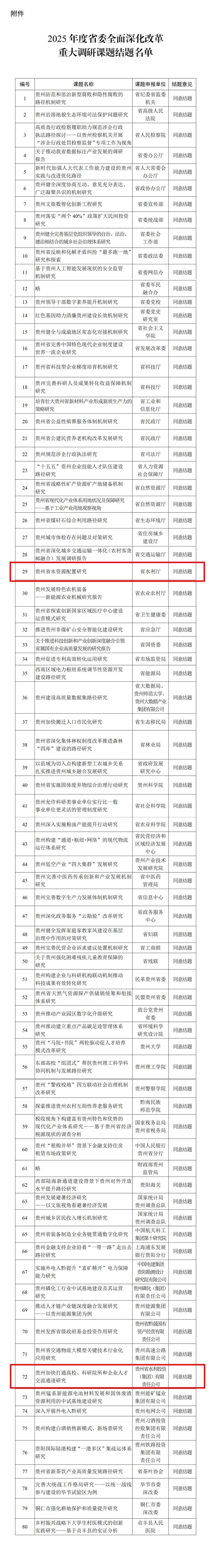 为进一步加强前瞻性谋划和穿透式研究,推动我省全面深化改革重大问题调查研究工作,切实提高改革决策的全局性、战略性、科学性,省委改革办组织开展了2025年度省委全面深化改革重大调研课题工作。自2025年1月以来,经组织课题申报、立项调研、中期评估、结题评审等环节,严把结题关,最终形成了80个结题调研成果(详见附件),参考专家建议80个课题均通过结题评审。