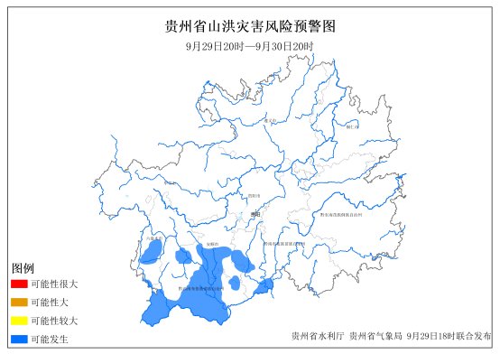 贵州省水利厅、贵州省气象局2025年9月29日18时联合发布山洪灾害风险预警: